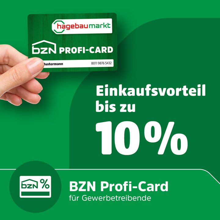 BZN Profi Card für Gewerbekunden: Profitiere in allen BZN hagebaumärkten von exklusiven Einkaufsvorteilen. Bis zu 10 % je nach Konditionsmodell (3 % Skonto bei SEPA-Lastschrift + bis zu 7 % Rabatt). Ideal für Handwerk und Bauprojekte. Jetzt persönlich oder telefonisch im hagebaumarkt anmelden.