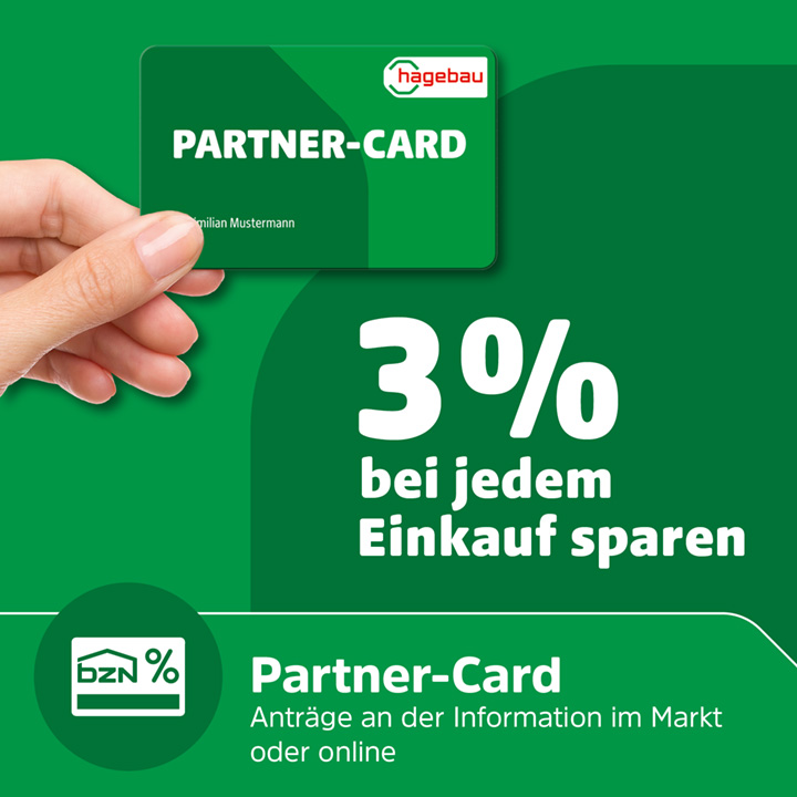 Mit der Partner‑Card sparst du bei jedem Einkauf 3 Prozent in den hagebau Standorten, in der hagebau App und online. Zusätzlich profitierst du von Rückvergütungen je nach Jahresumsatz. Die Karte ist kostenlos, ohne Gebühren und ohne Mindestumsatz. Jetzt Partner‑Card online oder im Markt beantragen.